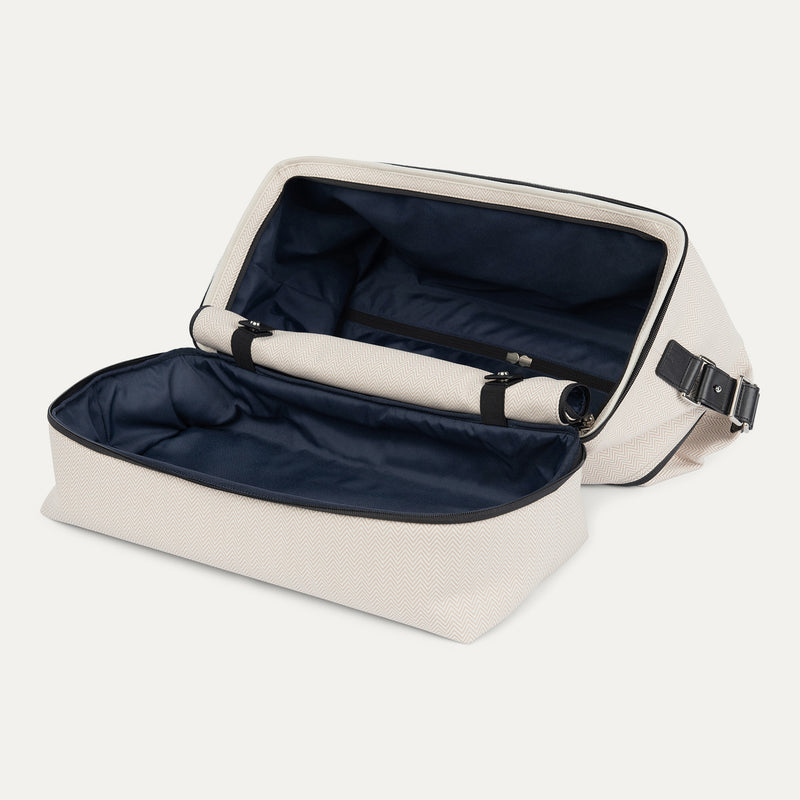 Crafted from buttery soft yet ultra-resilient fabric treated to resist stains and abrasions, it features genuine leather trim and a sleek, modern design. The bottom divider panel separates the main compartment from the lower section—keep it closed for organised packing, roll it up for a single large interior, or unzip and remove the bottom entirely to create a smaller, streamlined bag.