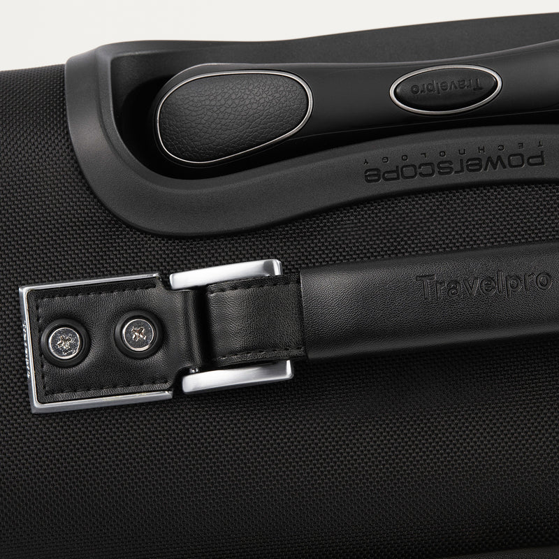 Patented PowerScope airline-grade aluminum extension handle minimizes wobble and has four stops at 36”, 38”, 40” and 42.5” (91.44 cm, 96.52 cm, 101.6 cm and 107.95 cm) to accommodate users of different heights