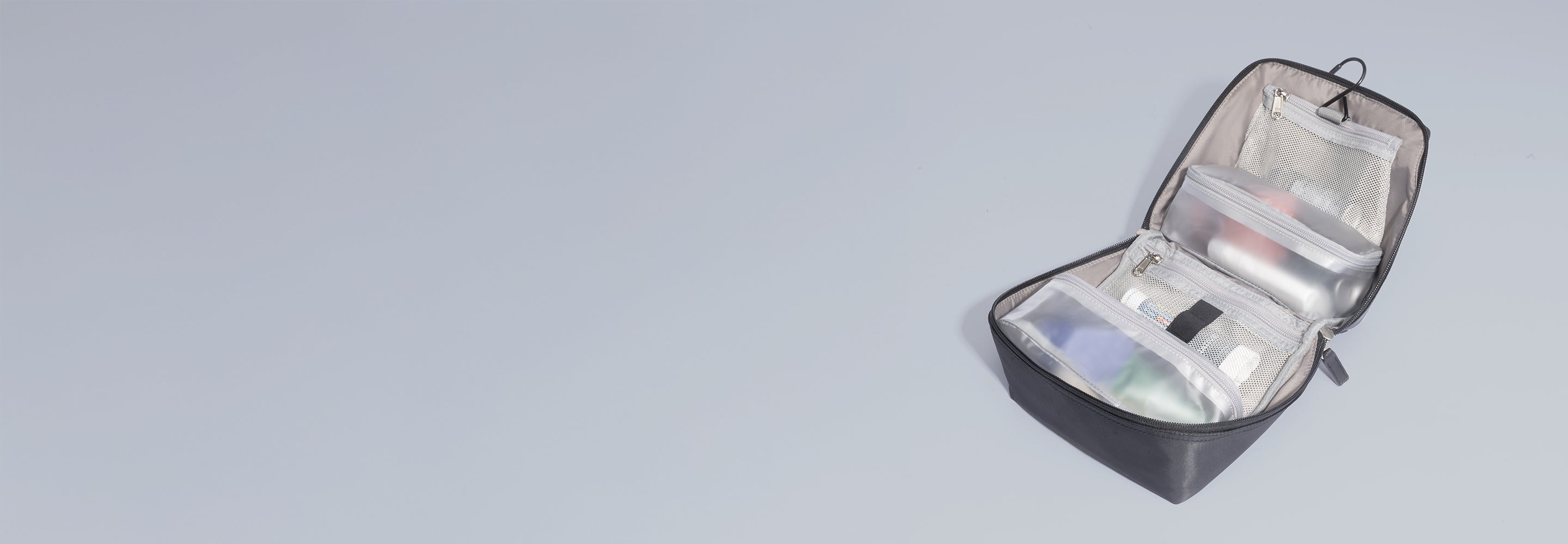 Compact, portable organisers designed to store personal care items and grooming essentials while travelling.